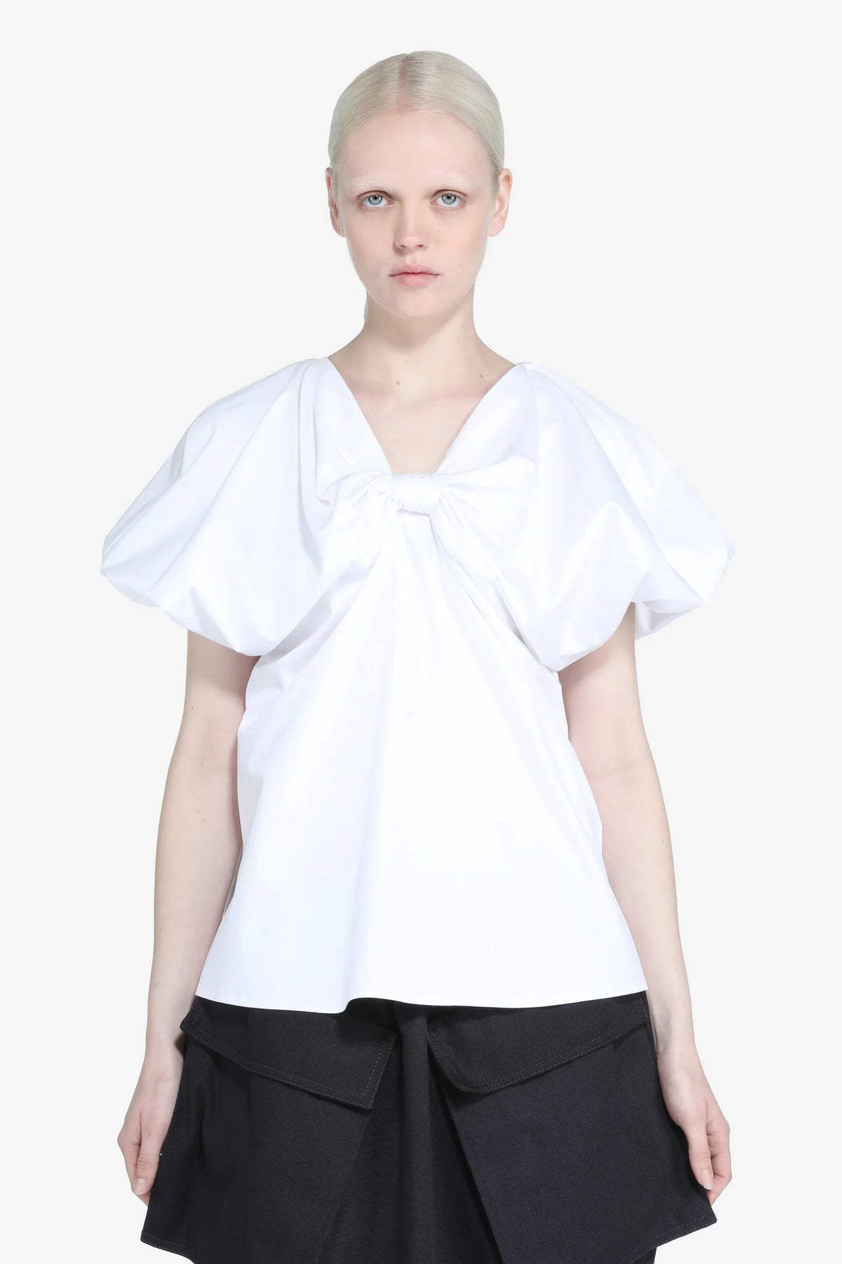 Blusa con maniche corte a sbuffo e scollo a V di N°21. Il busto presenta un dettaglio arricciato al centro. La silhouette è ampia e cade dritta dal busto, con cuciture pulite. Colore bianco.