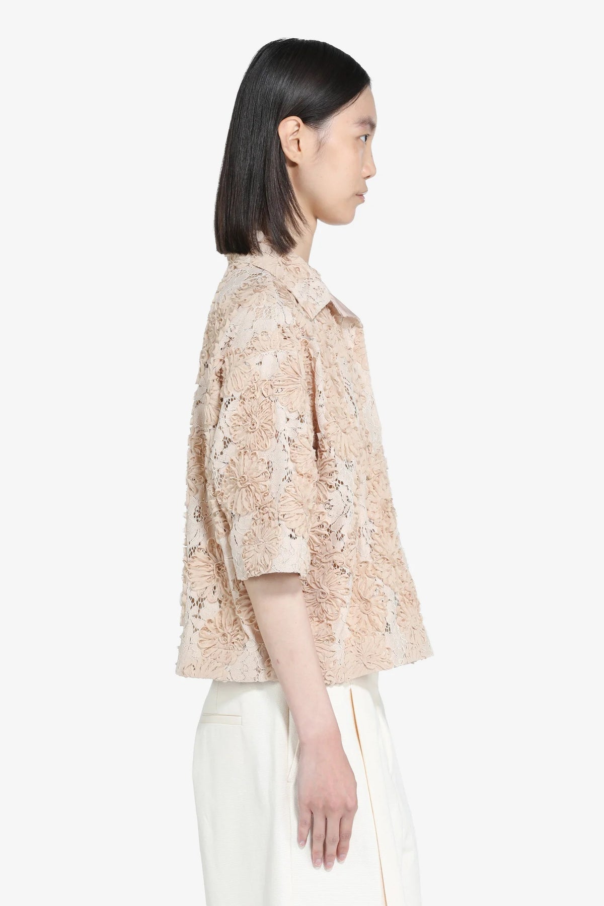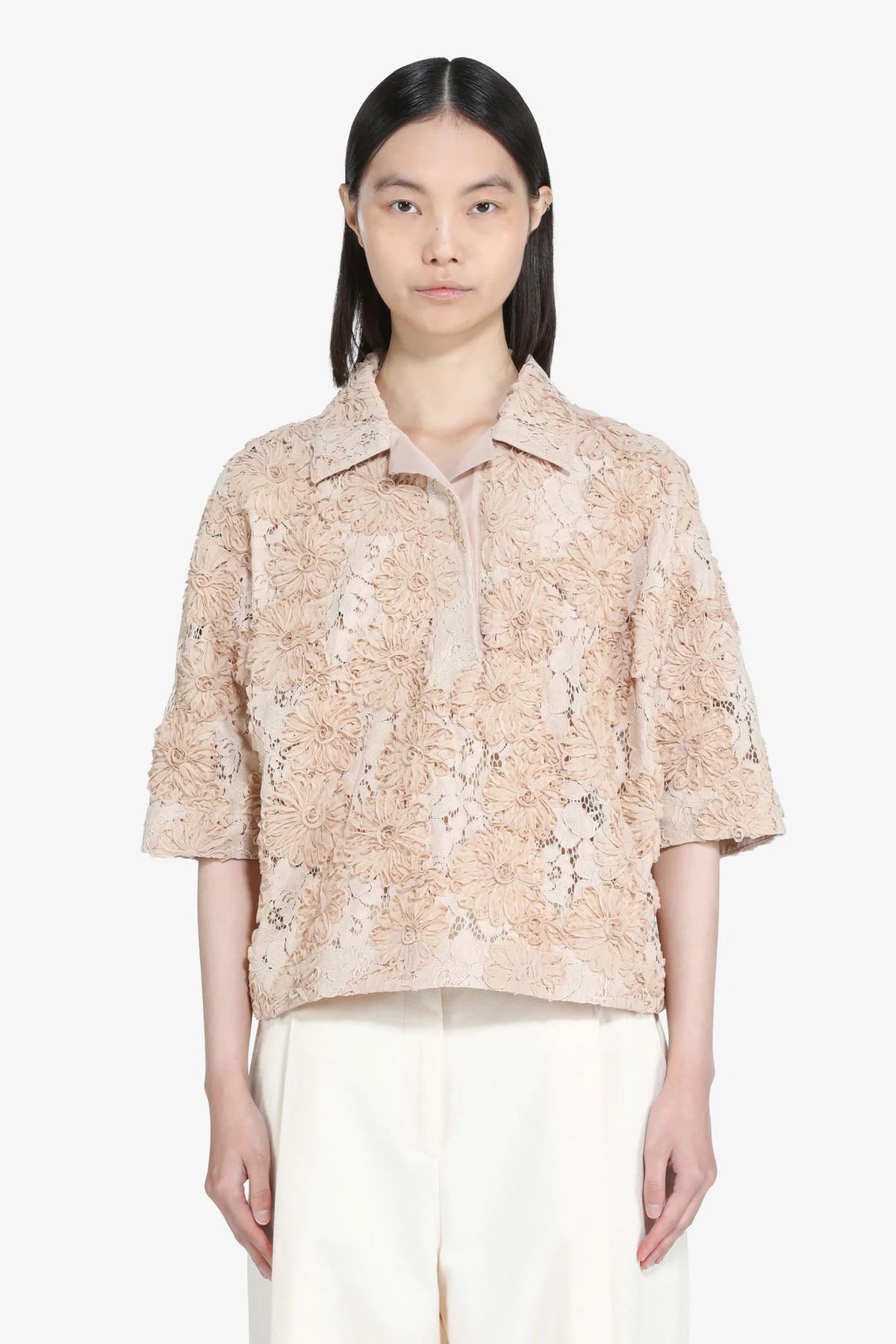 Polo boxy in pizzo con motivo floreale di N°21. Colore rosa cipria. Taglio dritto con maniche a tre quarti e colletto polo. La lavorazione è realizzata con pizzo ricamato e fodera interna.