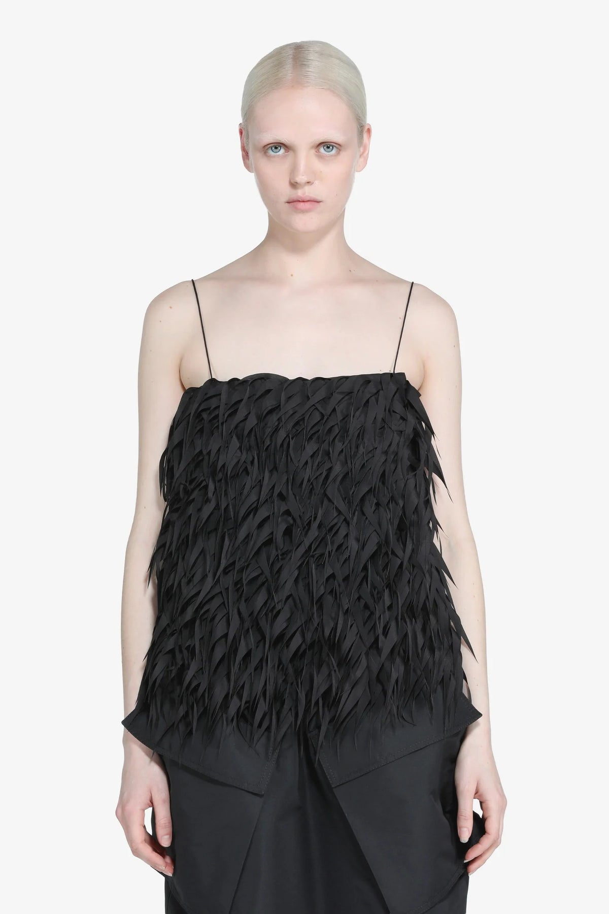 Top senza maniche con spalline sottili di N°21. Presenta una lavorazione a strisce che forma frange lungo la superficie. Il tessuto appare leggero e la costruzione ha un taglio dritto che arriva ai fianchi.