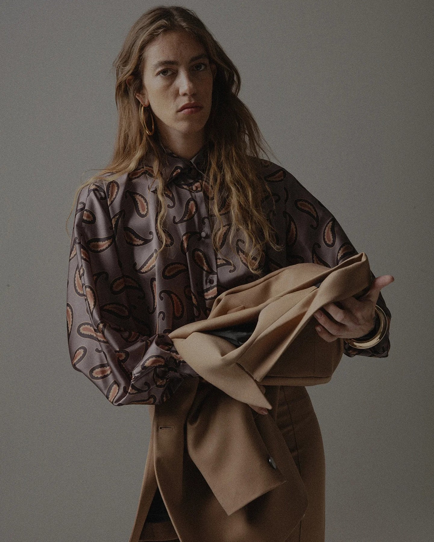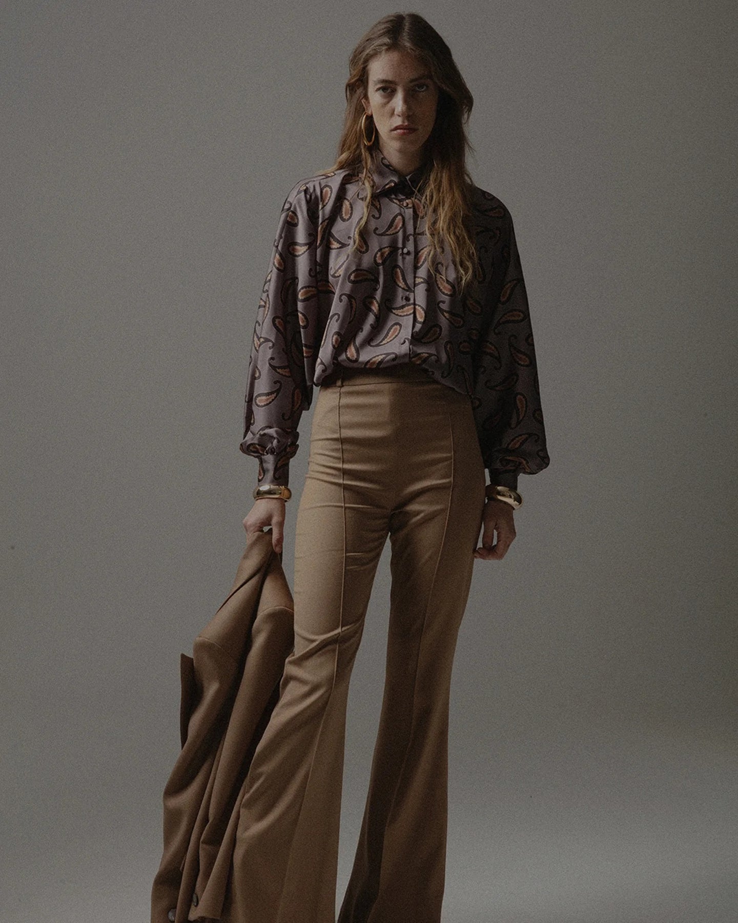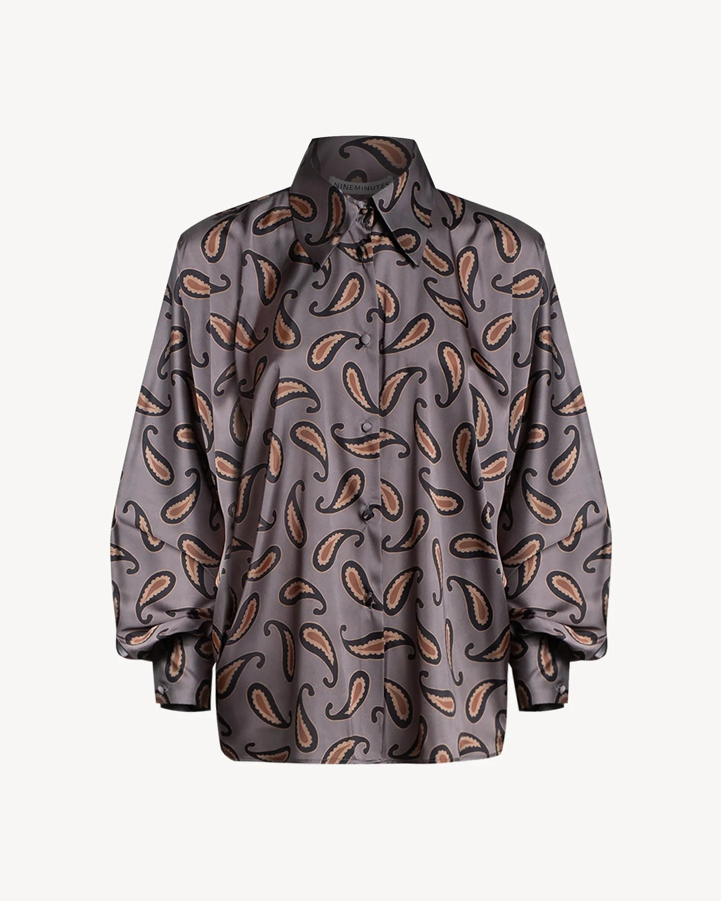Camicia The Kim in satin stampa paisley di NINEMINUTES con maniche ampie effetto pipistrello e polsini strutturati.