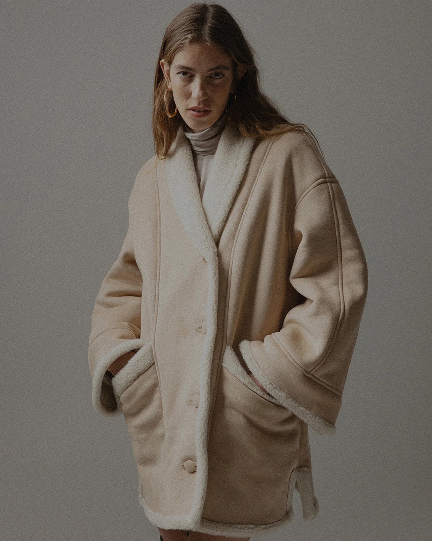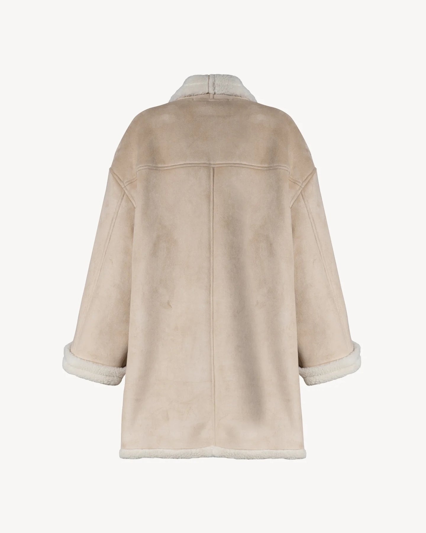 Eco-montone midi chiusura doppiopetto con bottoni ricoperti, con interno effetto shearling e revers ampi di NINEMINUTES. Maniche lunghe ampie.