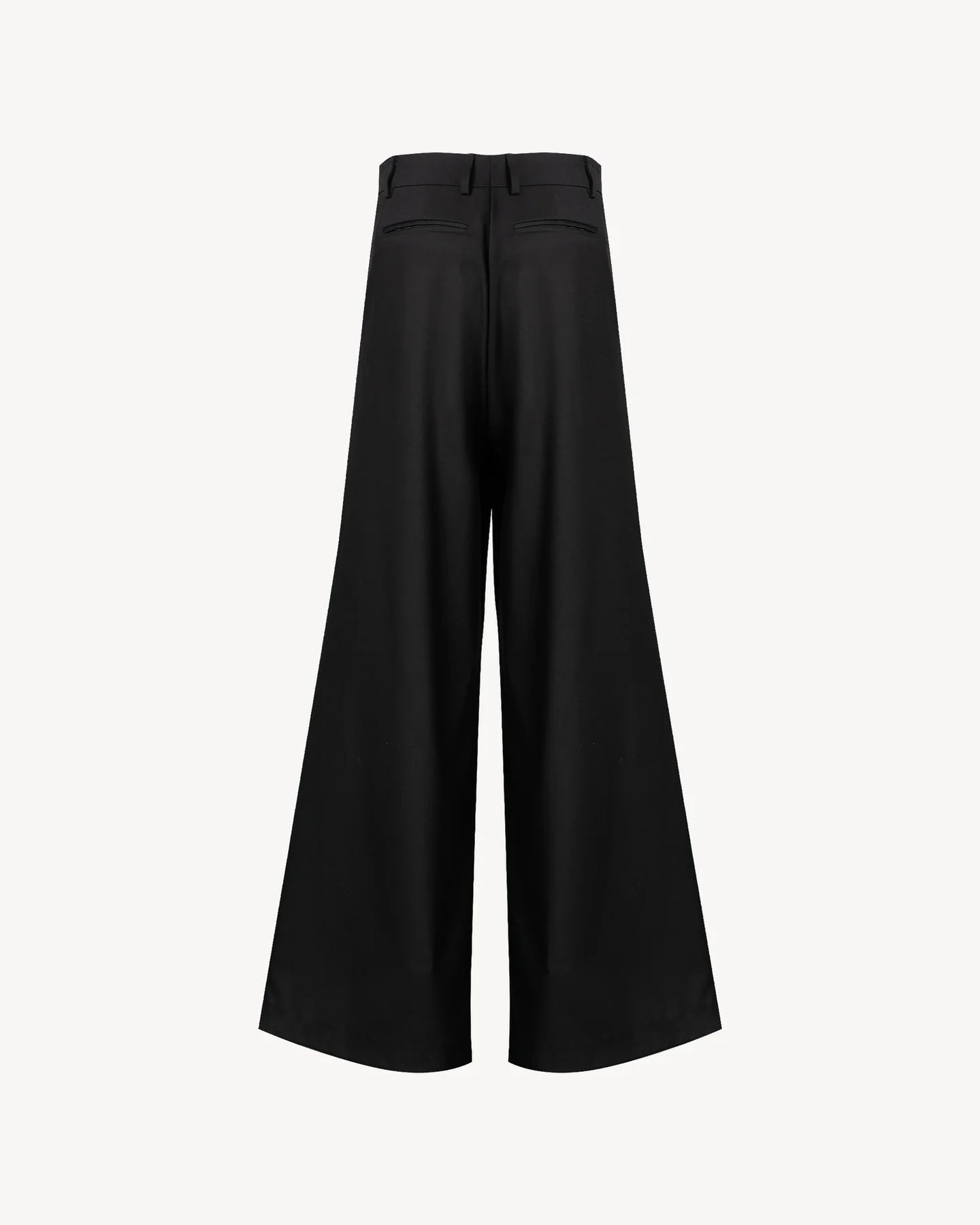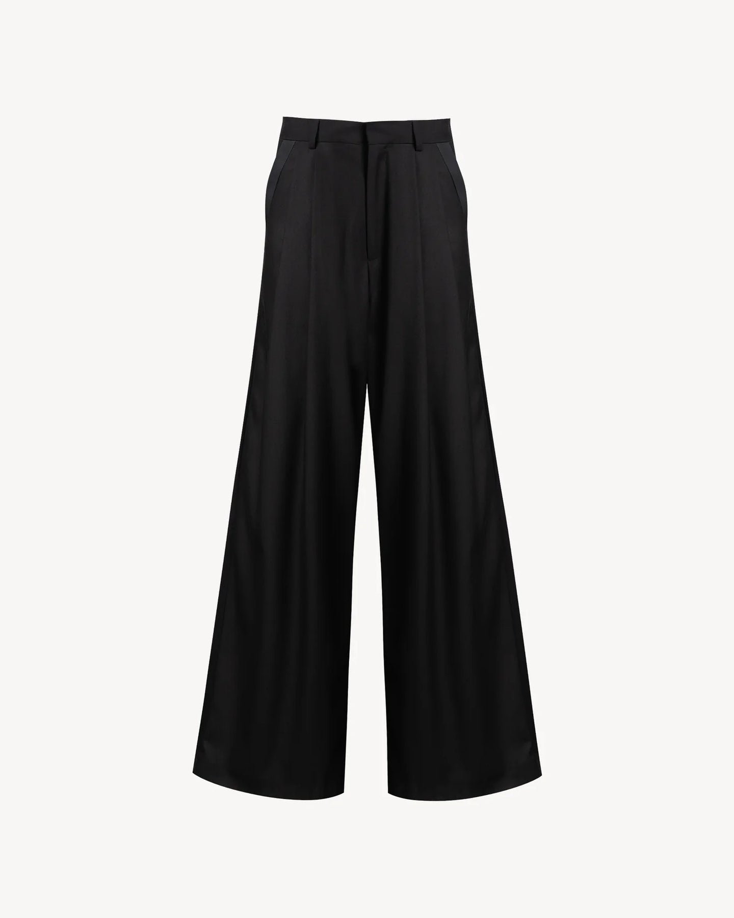 Pantaloni donna molto ampi in tessuto smoking, con vita regolare e caduta morbida.