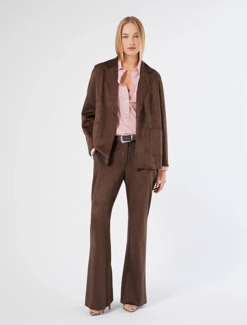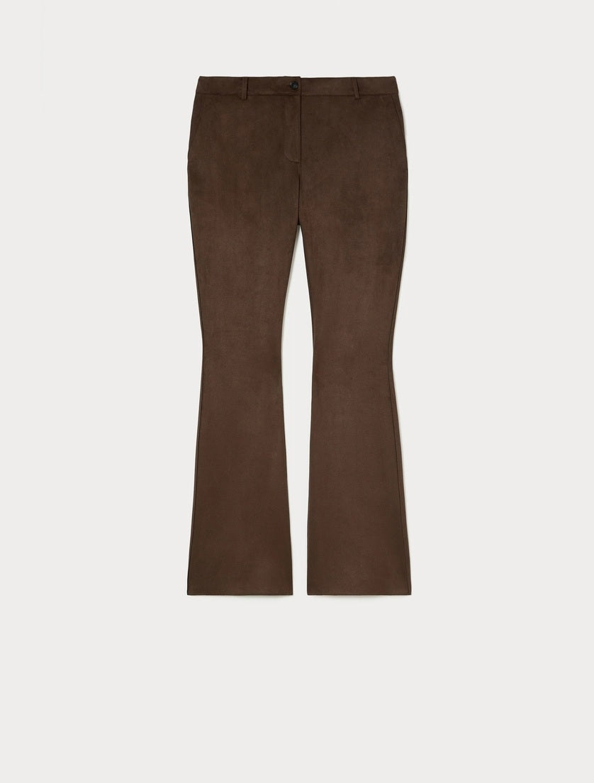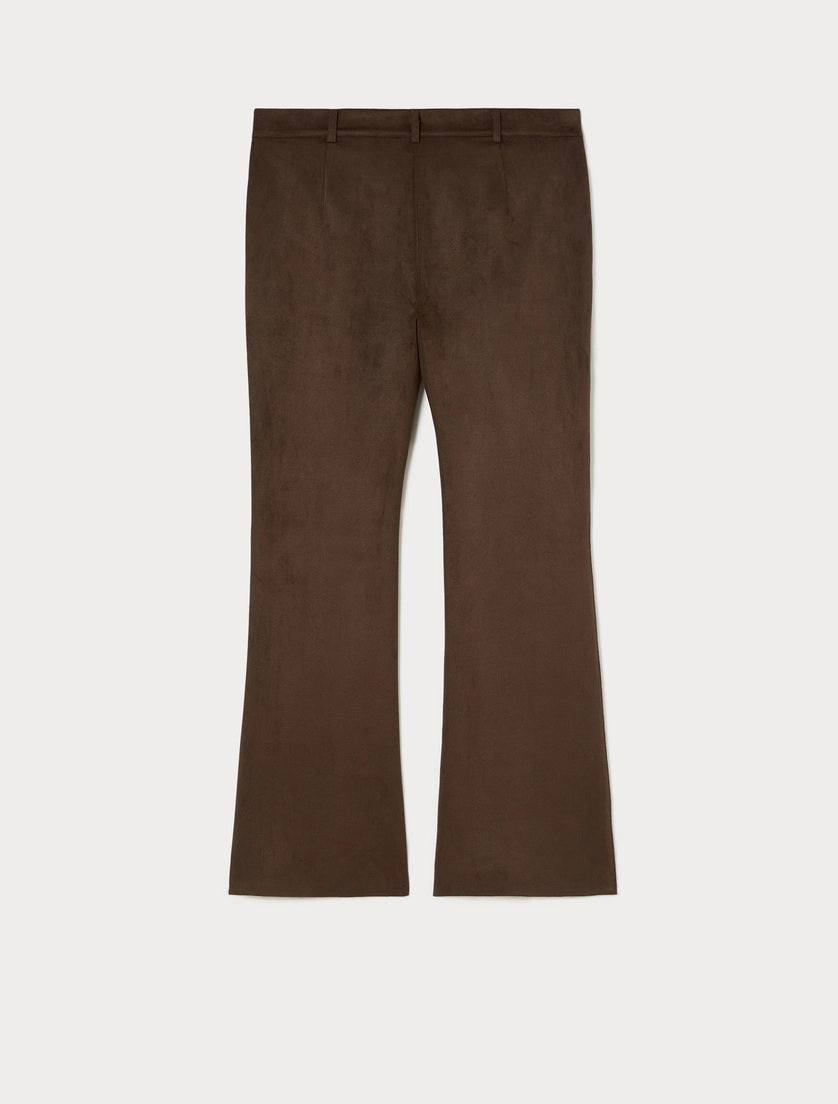Pantaloni in jersey effetto scamosciato, dalla linea flare. Sono rifiniti a taglio vivo al fondo.