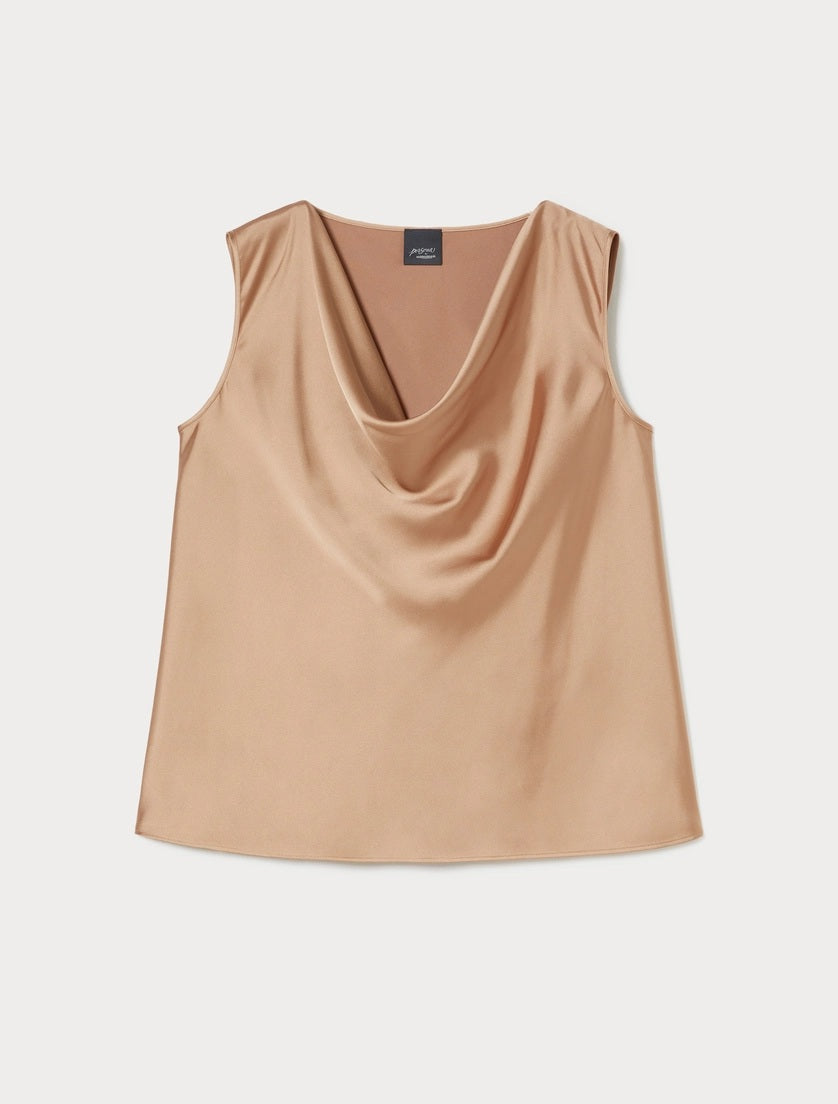 Top in raso con collo drappeggiato di PERSONA by MARINA RINALDI. Puoi applicare le maniche corte in dotazione con un semplice intervento di sartoria dedicato.