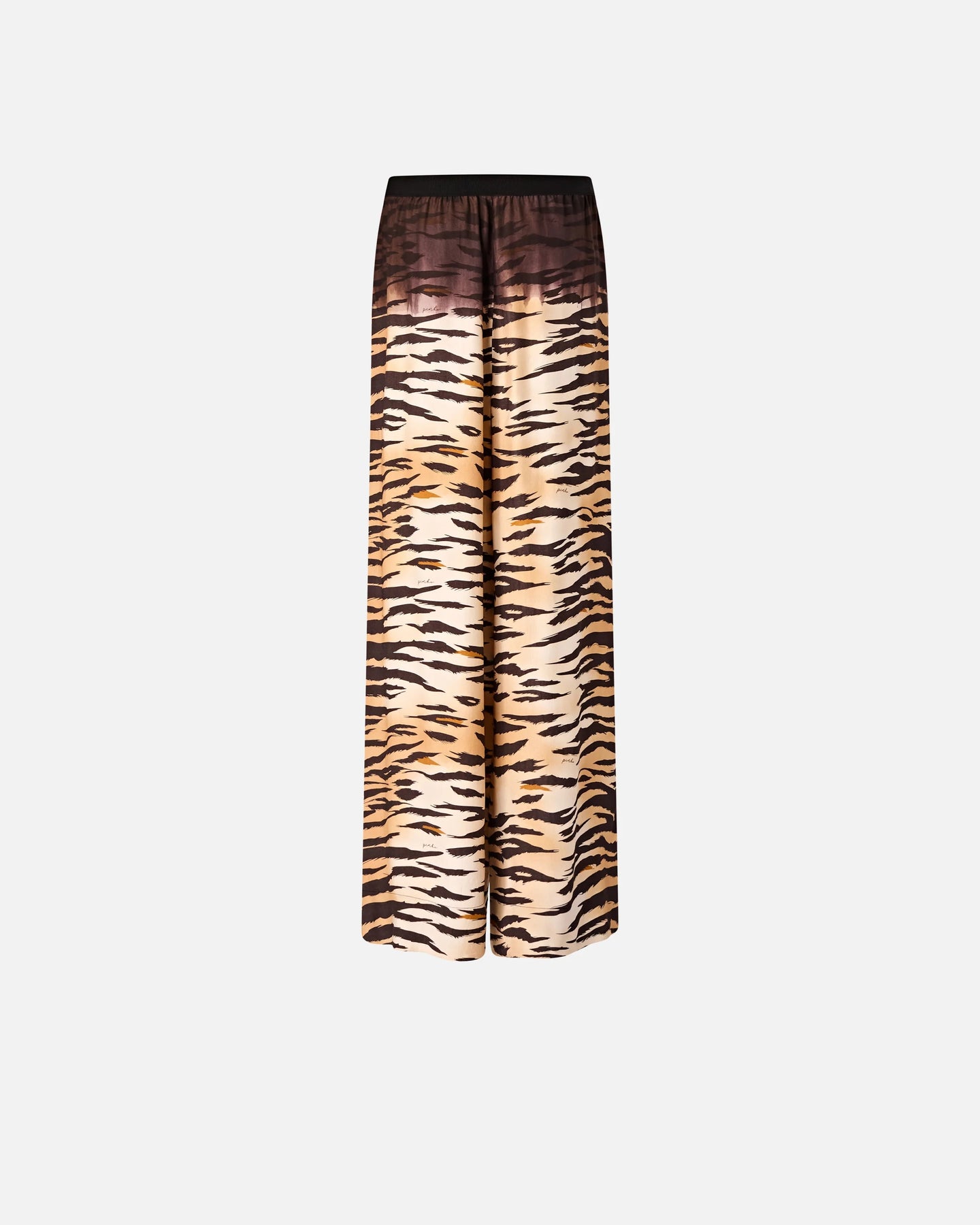 Pantaloni realizzati in tessuto twill dalla mano fluida e lucente, particolarmente adatto anche per la stagione estiva. Il modello si distingue per la seducente stampa animalier tigrata con parte superiore più scura dall'effetto sfumato, che viene piazzata a mano su ogni capo per trasformarlo in una creazione unica e inimitabile. I pantaloni sono completati dall'etichetta con logo lettering PINKO sul retro.