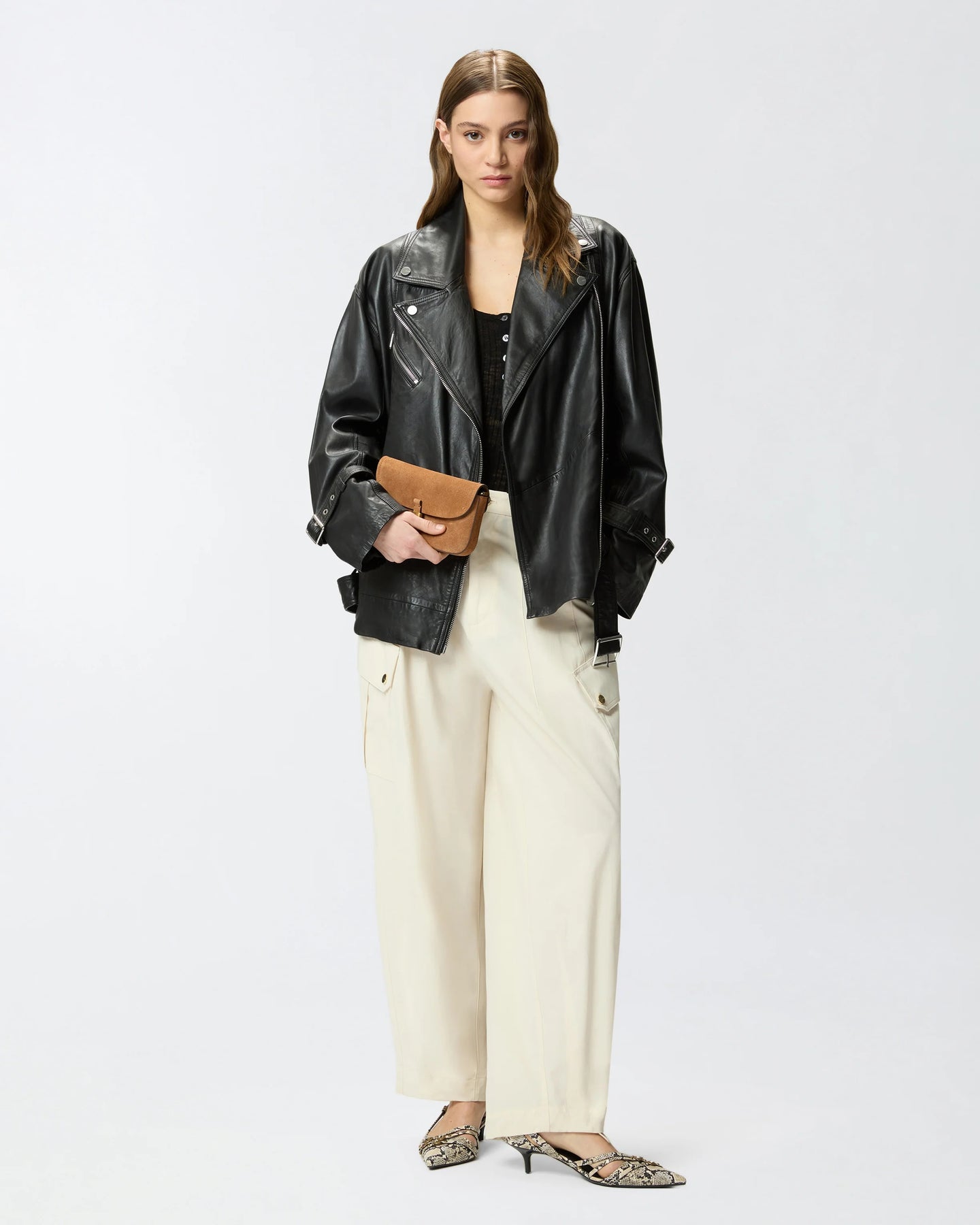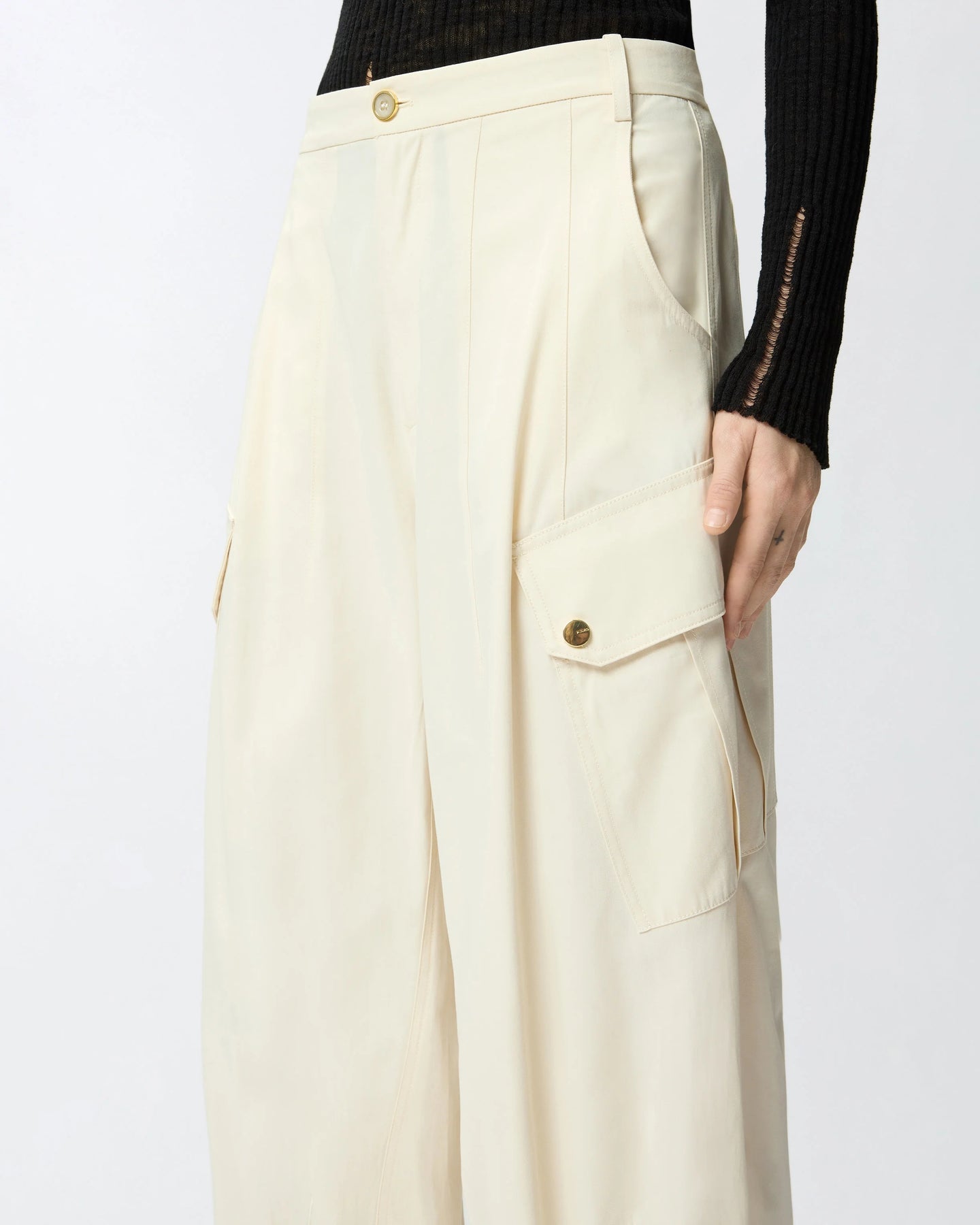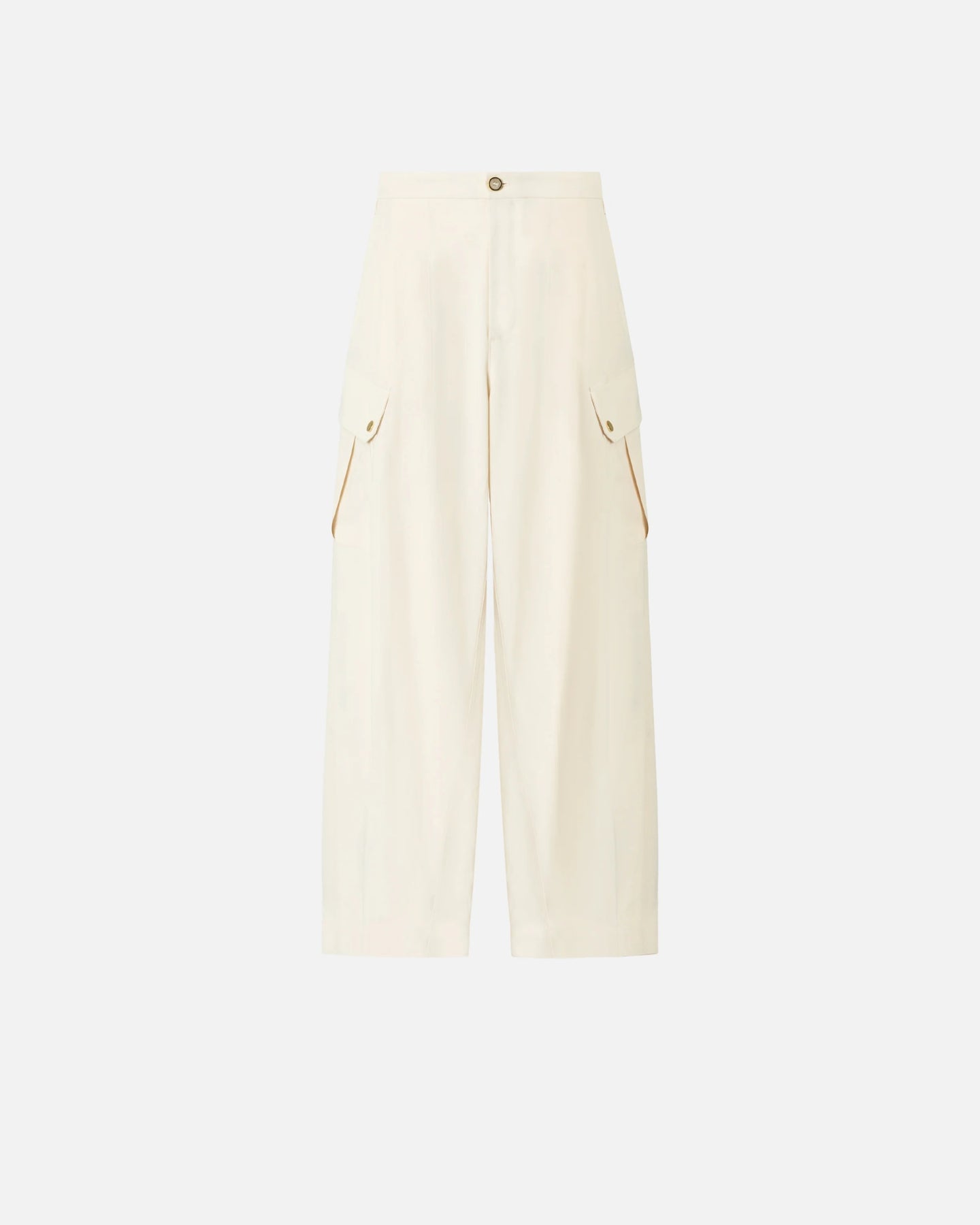 Pantaloni in twill di puro cotone dalla mano increspata e al contempo fluida di PINKO. Il capo, dalla linea ampia, è caratterizzato da due tasche laterali, due tasche posteriori applicate e due tasche con patta e bottoni lungo la gamba, ed è completato da una pratica coulisse al fondo per permetterti di personalizzare lo styling. Il modello è foderato per assicurare un maggiore comfort durante l'indosso.