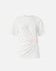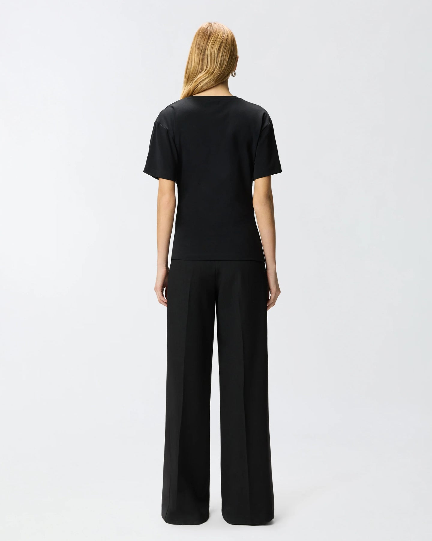 T-shirt girocollo a maniche corte realizzata in interlock stretch di cotone Supima, un tessuto di prima qualità caratterizzato da una mano morbida e compatta e da un effetto di lucentezza. A impreziosire il capo non poteva mancare il dettaglio glamour in puro stile PINKO: un'applicazione dorata in corrispondenza della vita che crea un raffinato drappeggio sul davanti.