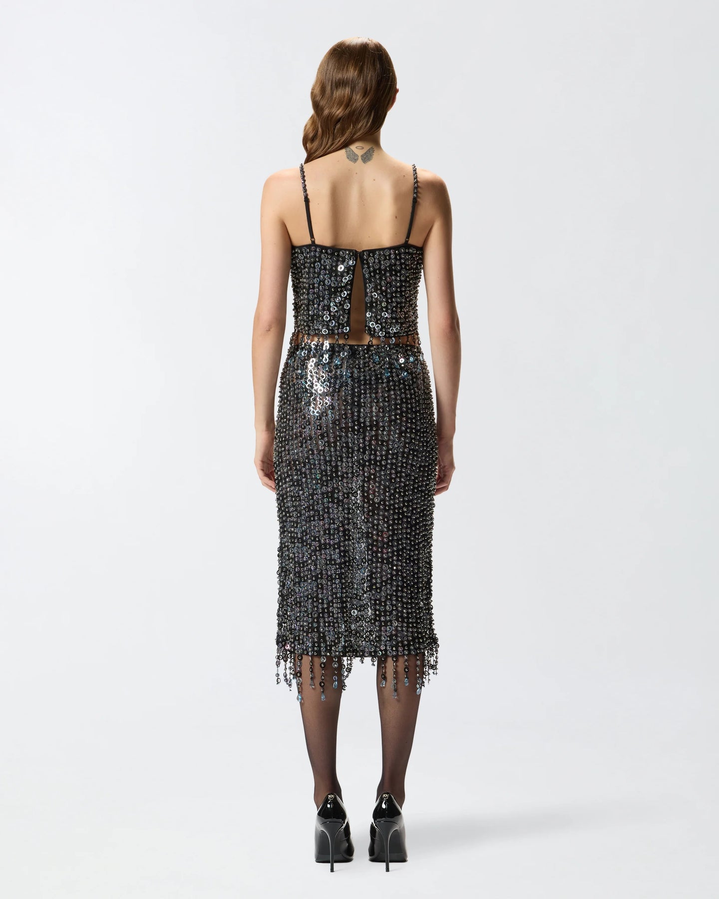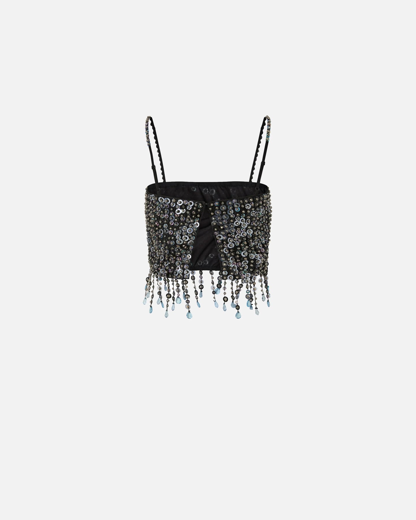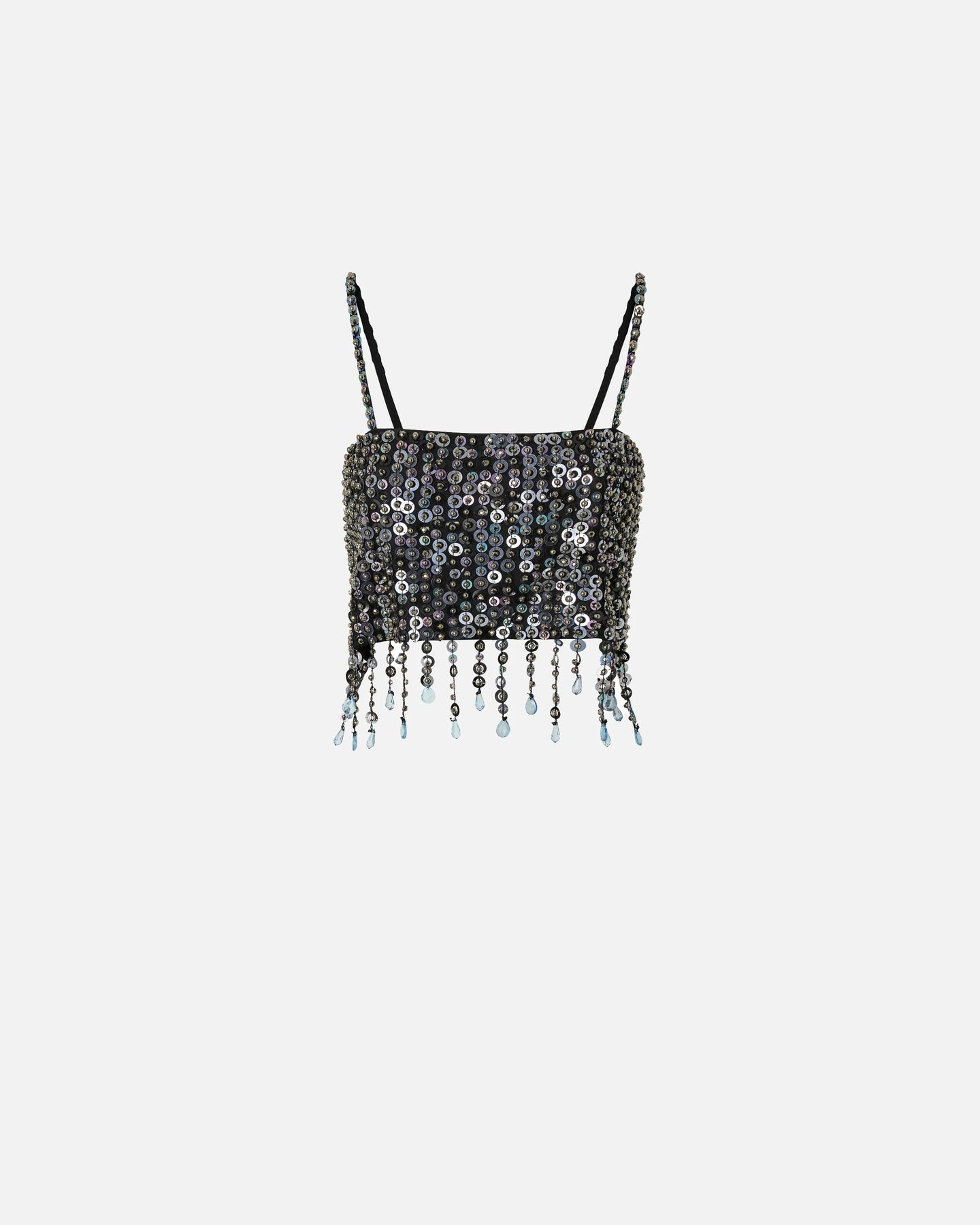 Top a fascia con spalline sottili impreziosito da una cascata di paillettes rotonde con all'interno cristalli di vetro e piccole sfere metalliche che creano luminosi riflessi nei toni del nero e del blu. Il fondo del capo è rifinito da sottili frange che ricadono in modo leggero e che conferiscono un tocco di dinamicità e movimento in puro stile PINKO. L'apertura sormontata con bottone singolo sul retro assicura un indosso facile e confortevole.
