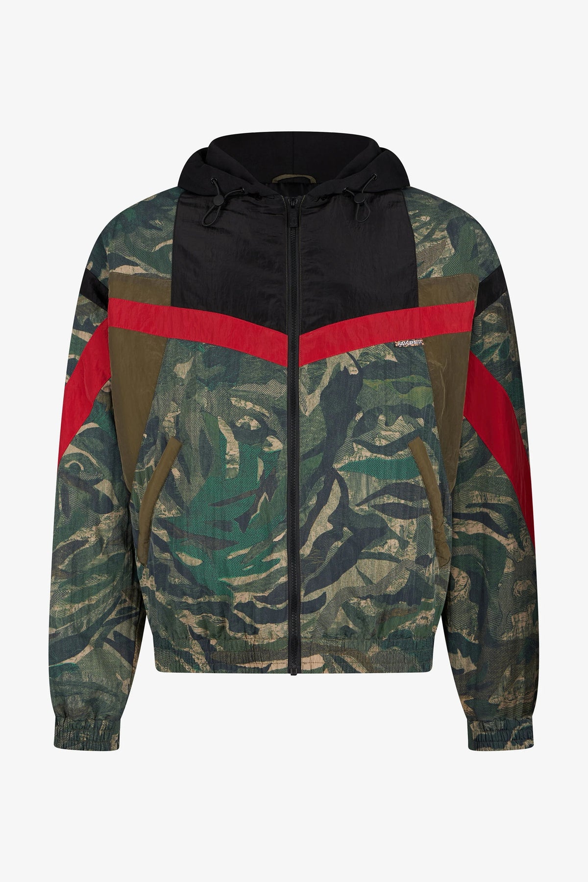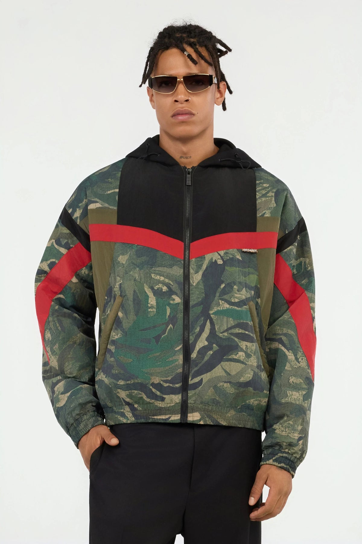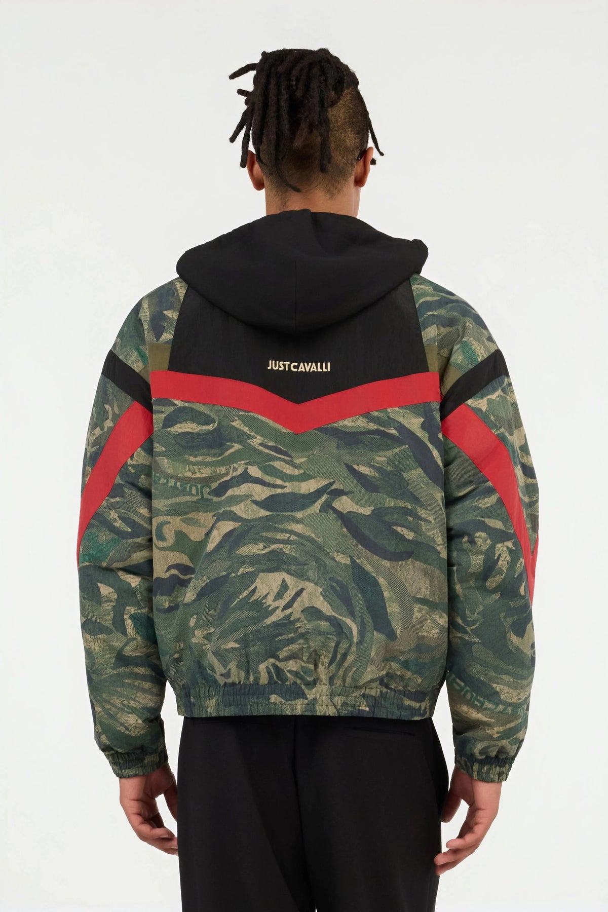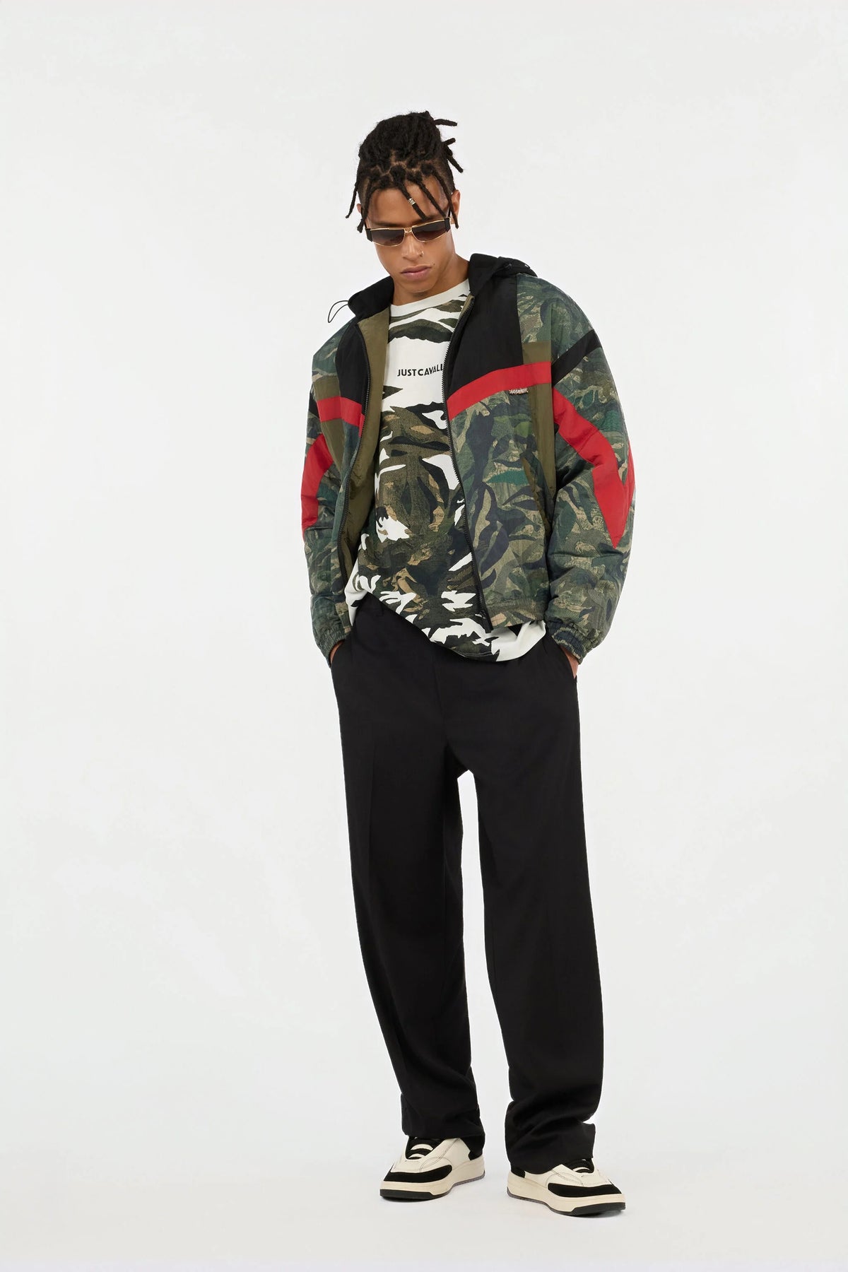 Stampa Tiger Camu di JUST CAVALLI. Questo capo fonde l'energia selvaggia della stampa iconica con un design contemporaneo a blocchi di colore. I dinamici accenti rossi risaltano sul camouflage, creando un look audace e naturalmente cool.