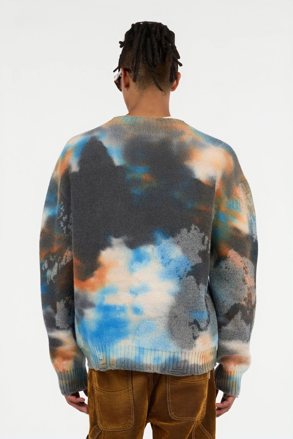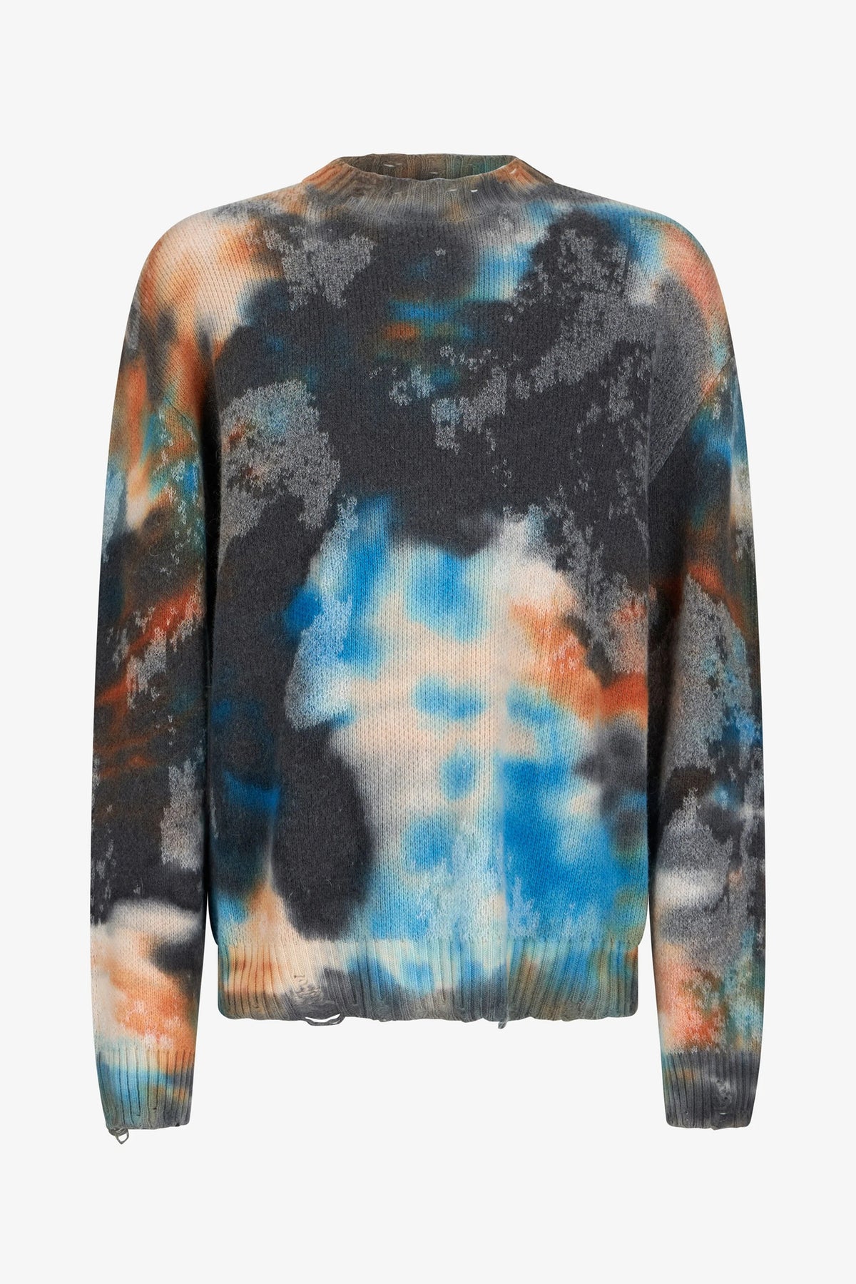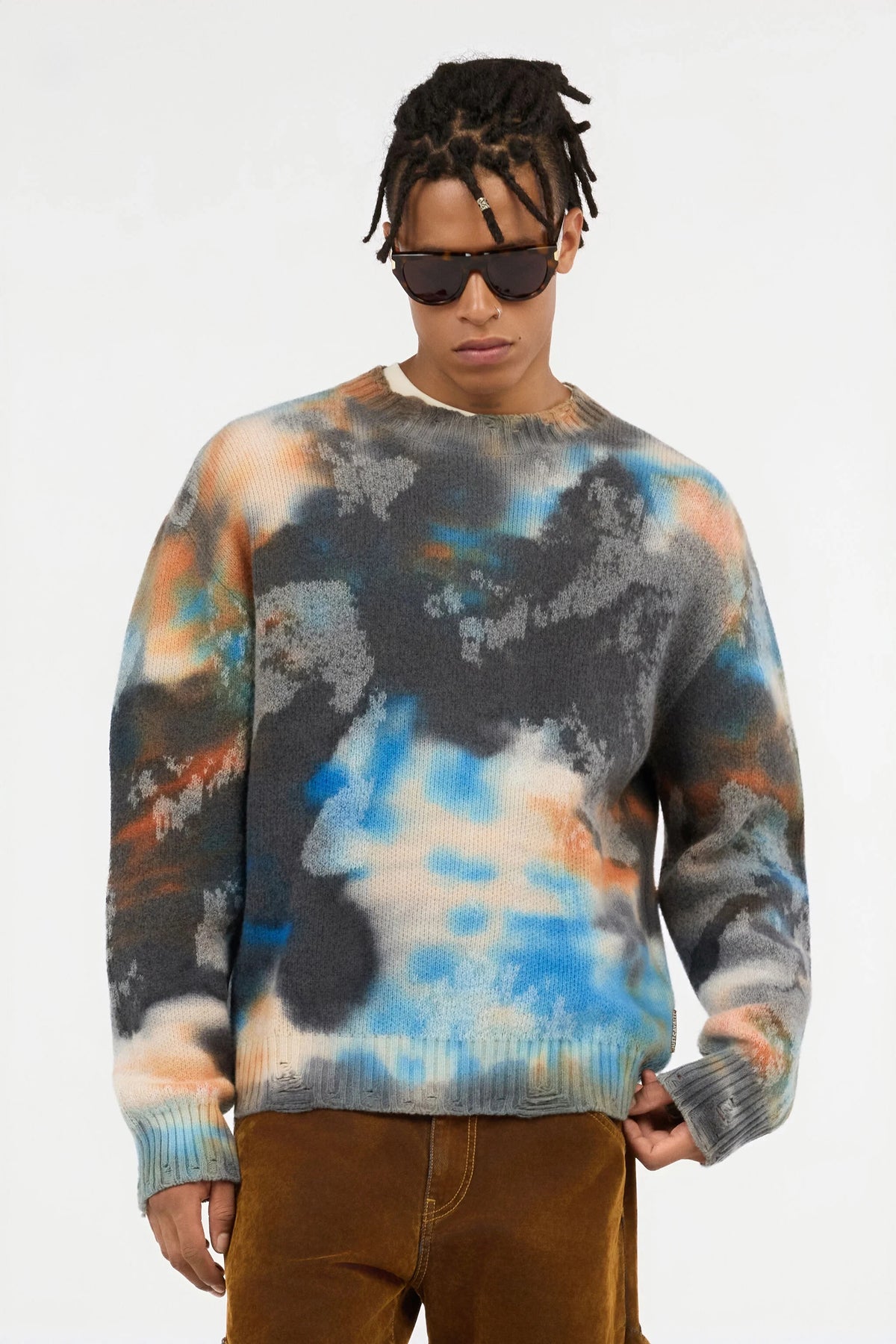 Maglione Rusty Stain di Just Cavalli. L'esclusiva stampa evoca la bellezza astratta delle superfici consumate dal tempo, con vivaci spruzzi di blu e arancione su una tela grigio scuro. La vestibilità morbida e i dettagli volutamente consumati sull'orlo e sui polsini aggiungono un tocco ribelle e urbano.