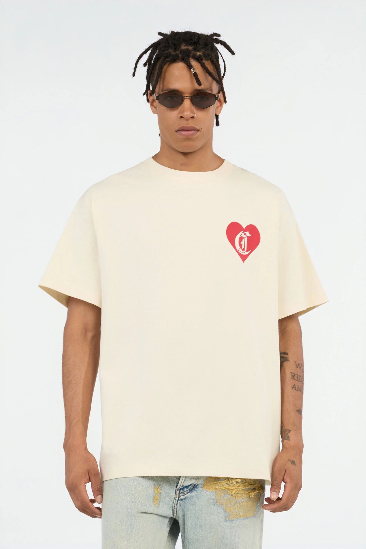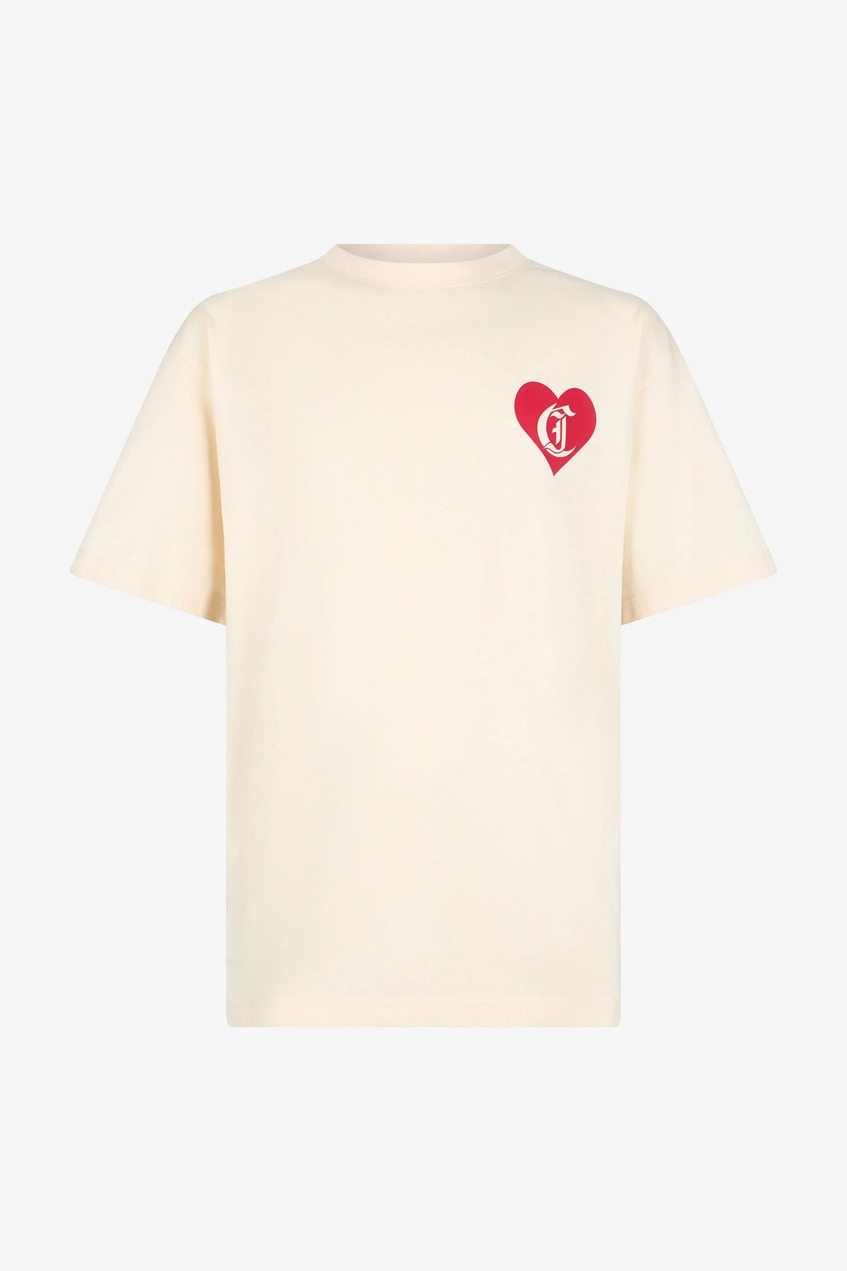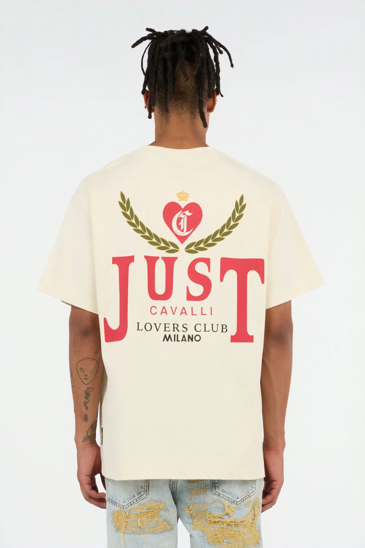 T-Shirt Lovers Club di JUST CAVALLI. Il design gioca sui contrasti, con un piccolo emblema a forma di cuore sul davanti che sboccia in una grafica audace e di ispirazione araldica sul retro.