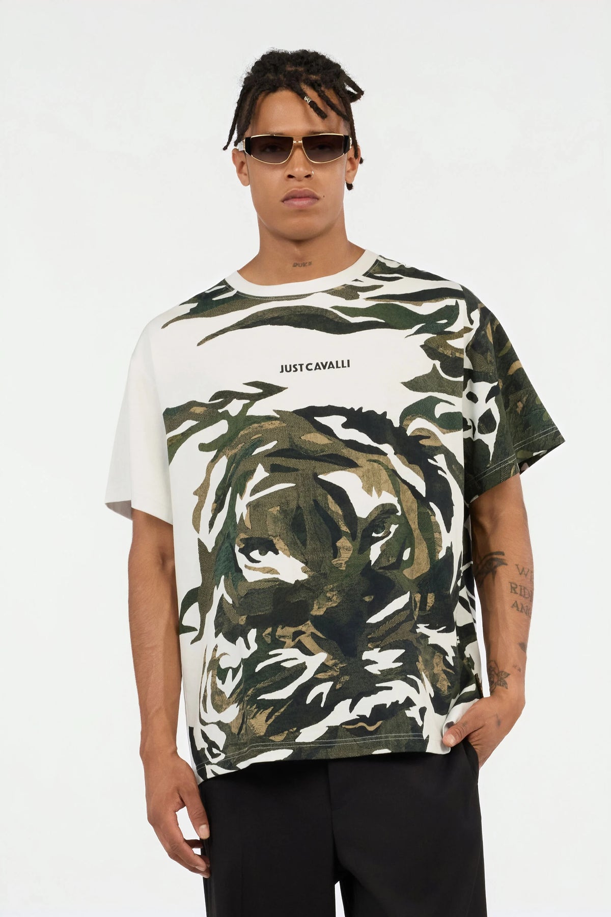 T-shirt Tiger Camu di Just Cavalli. Questo capo fonde magistralmente lo sguardo feroce di una tigre con un motivo mimetico contemporaneo, creando una grafica potente e di tendenza. Il disegno avvolge il capo per un effetto dinamico e avvolgente, sottolineato dal discreto logo Just Cavalli sul petto. È una dichiarazione di audace individualità, perfetta per chi ama attirare l'attenzione con il proprio stile.