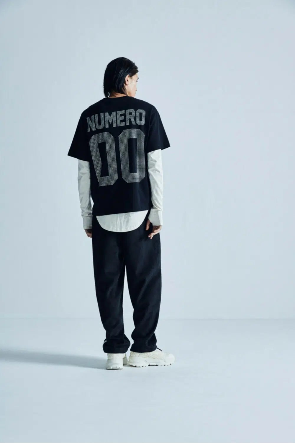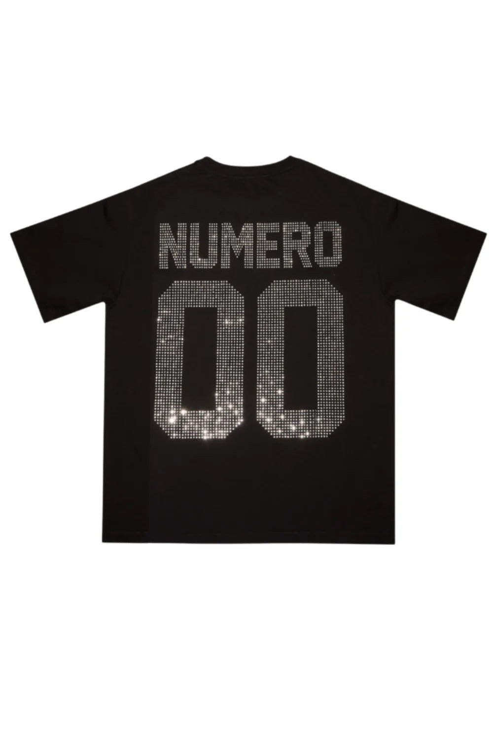 T-Shirt Strobo Effect con logo NUMERO00 strass, che evoca l'intensità delle luci stroboscopiche dei club.