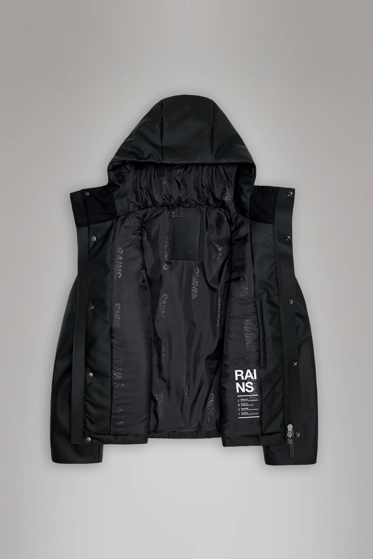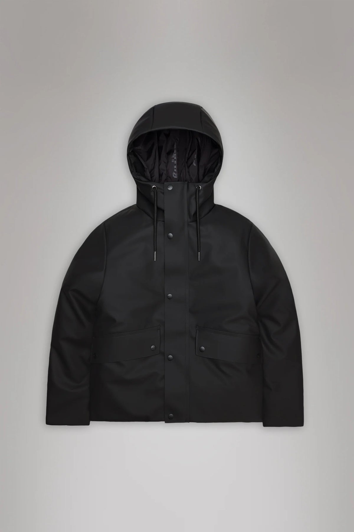 La giacca waterproof è realizzata con l'iconico tessuto PU di Rains, con una parte posteriore in tessuto forte e resistente. La mano è pulita, con un aspetto epurato e una sensazione liscia al tatto.